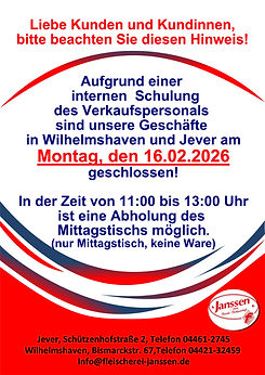 Am Montag, den 16.02.2026 aufgrund einer internen Schulung geschlossen.